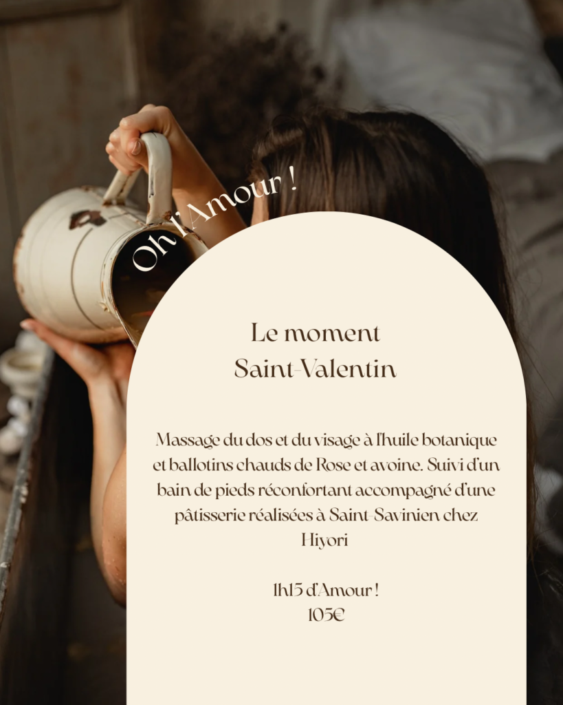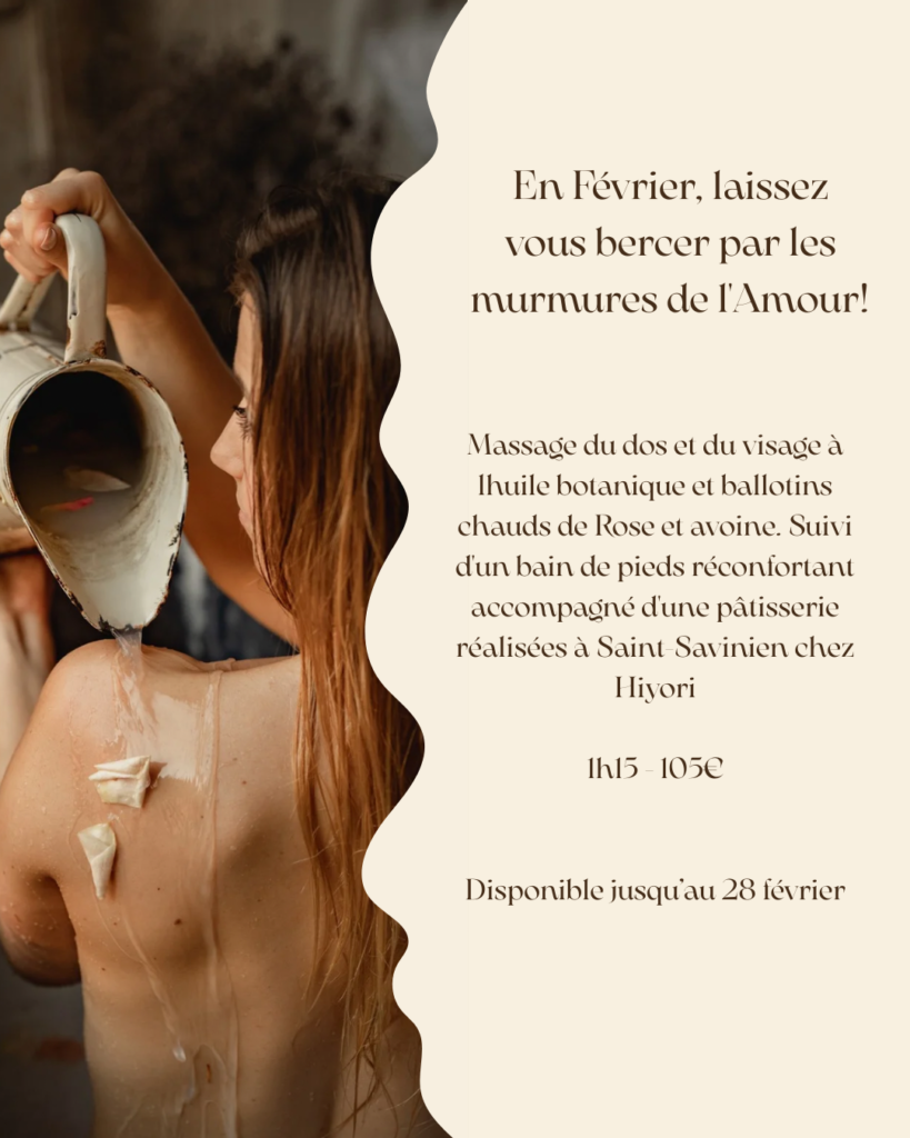 Massage « sur-mesure » du corps, soin du visage intense réconfortant aux ballotins chauds du moment, à la mousse de savon au lait de chèvre et baume au choix réalisés par Cécile savonnière de Saintes. Suivi d’un bain ancestral au lait de notre région du moment.